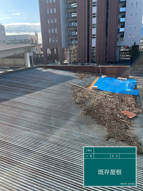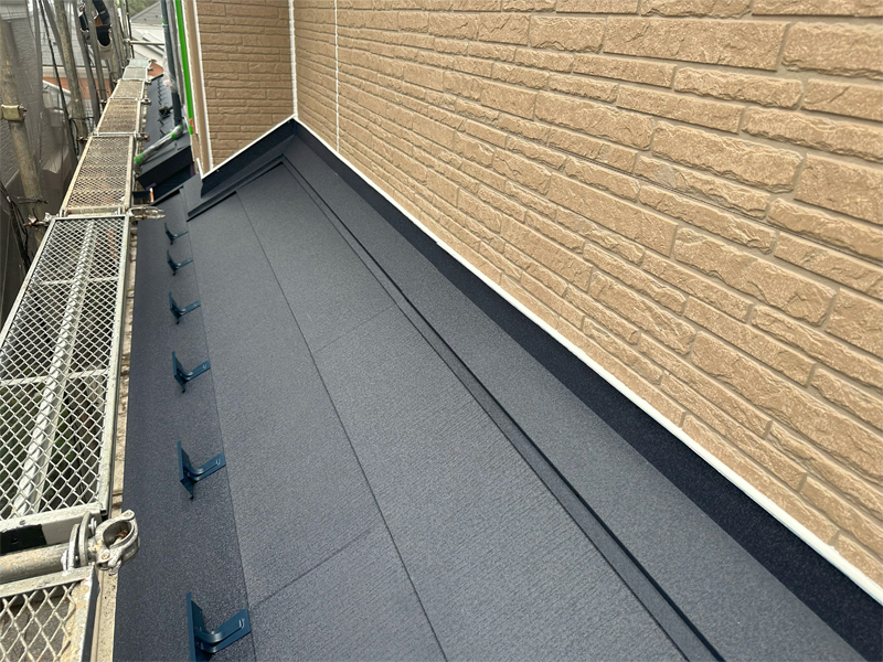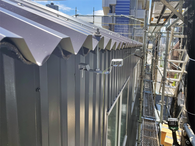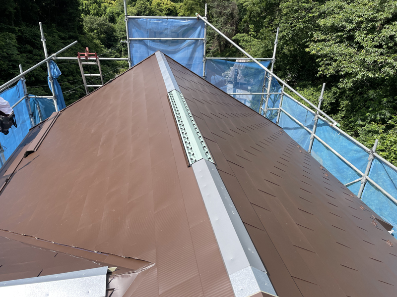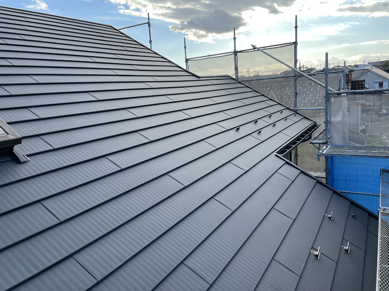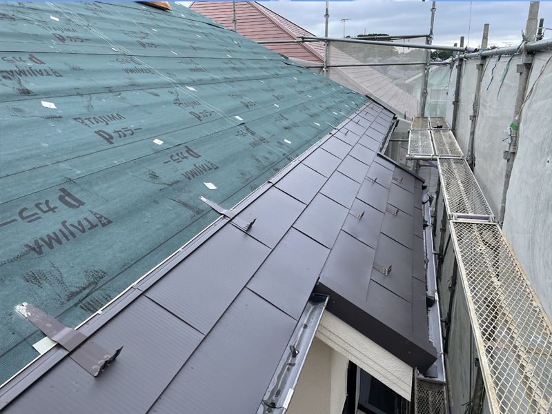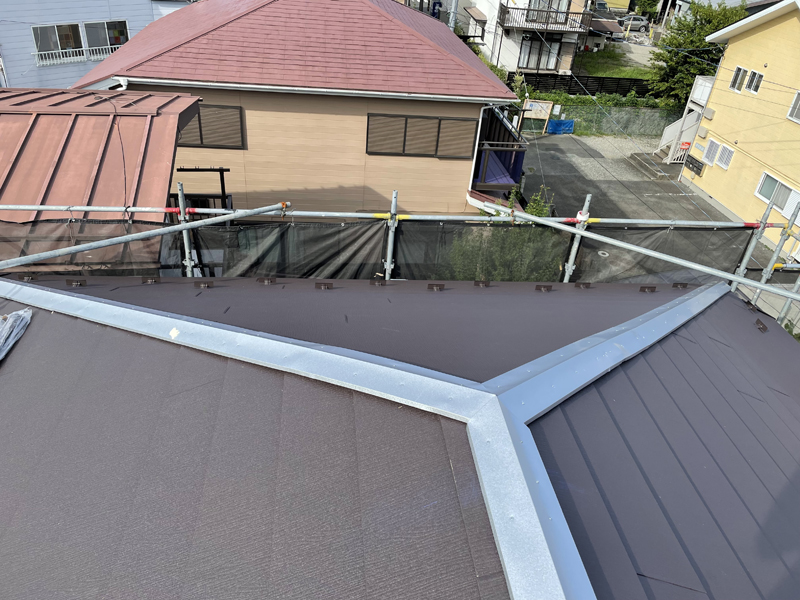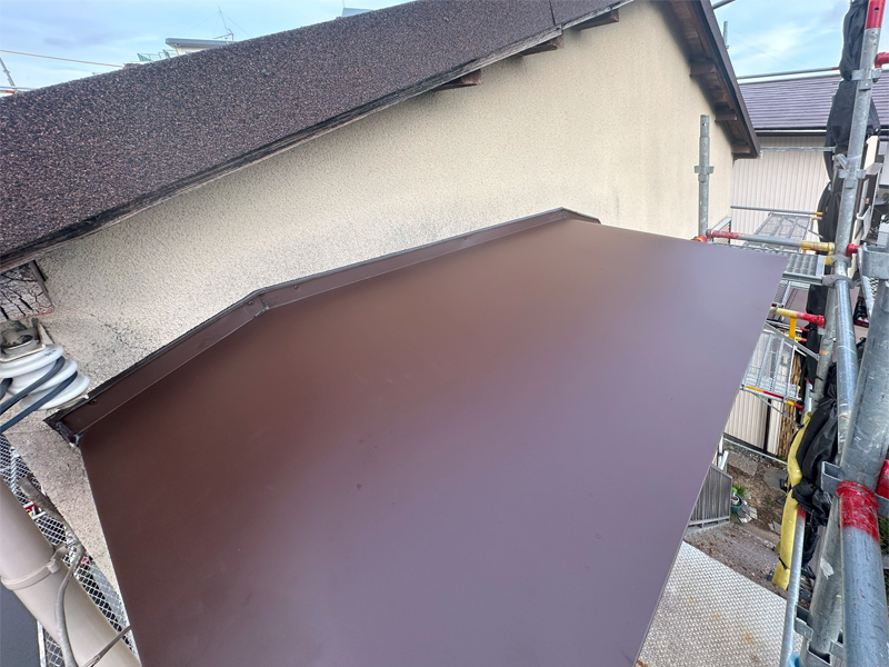 既存材の上にカバー工法で、ガルテクトを葺きました。ガルテクトおよびスーパーガルテクトは、広く使用される金属屋根材です。