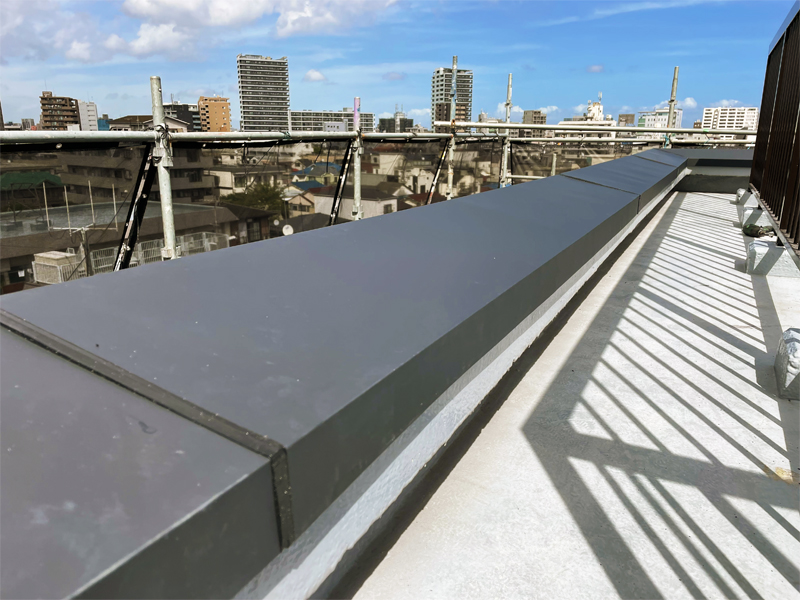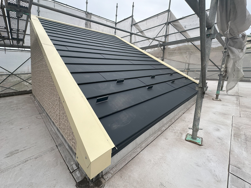 屋上のペントハウス屋根(塔屋)を、(株)メタル建材製の金属屋根材のリファーナでカバー工事して、周囲の笠木板金加工取り付け工事を行いました。