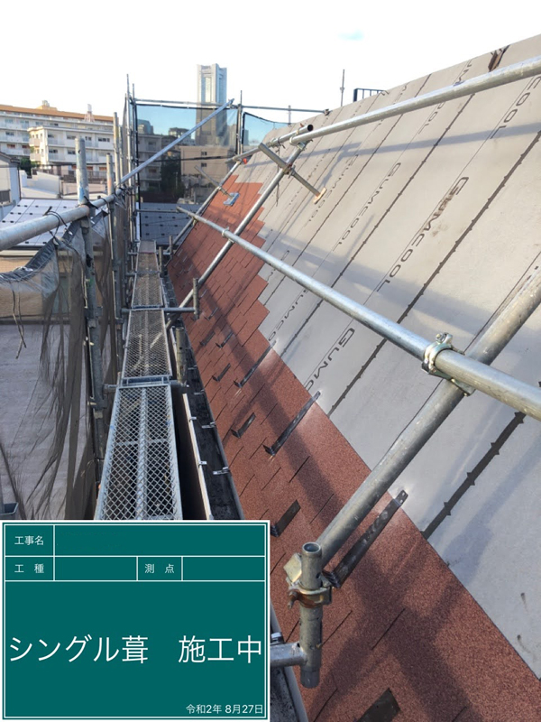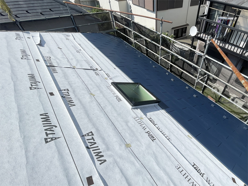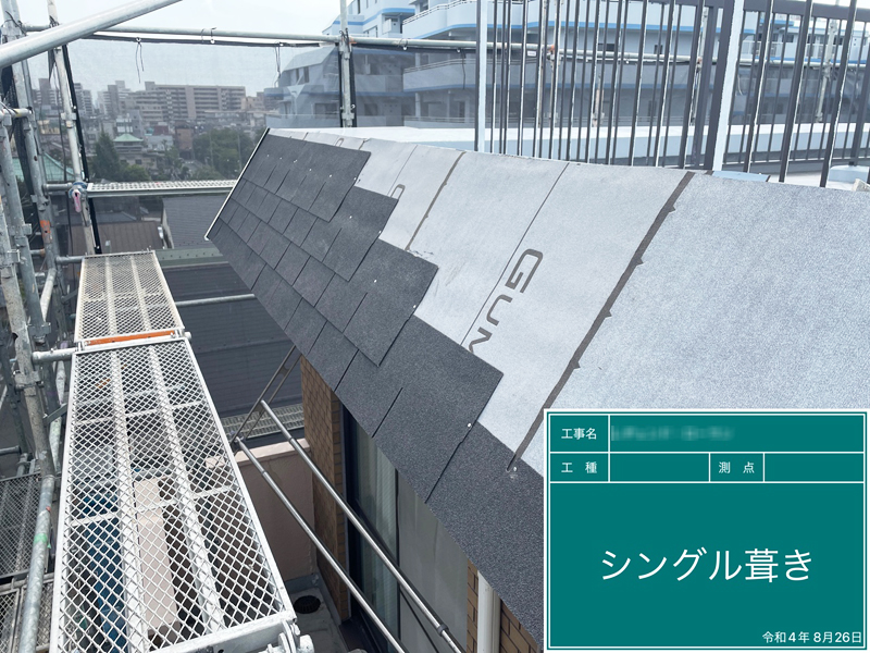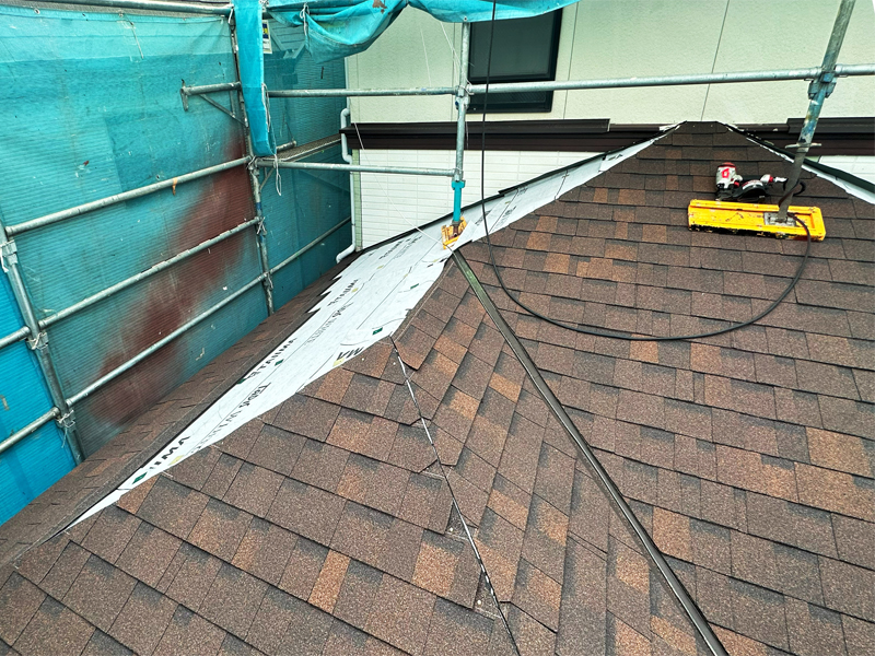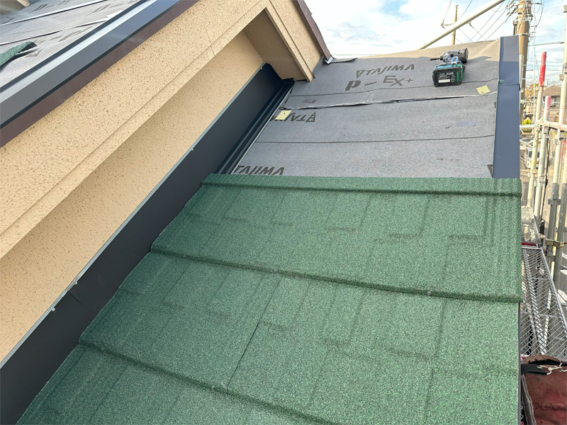 カバー工法で既存材の上に、同じ田島ルーフィング(株)製のシングル材を葺き重ねました。色も同じブラックスワンです。