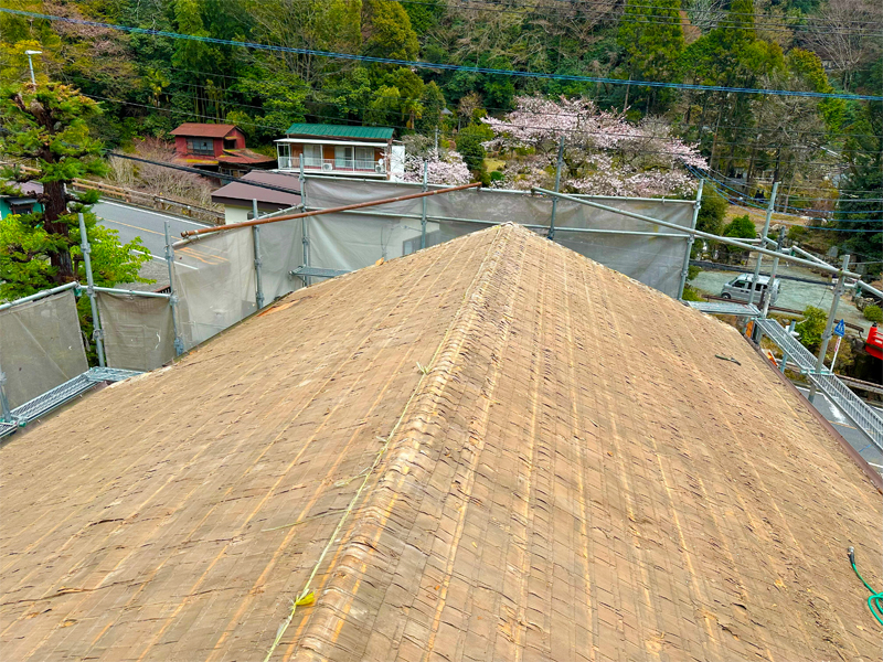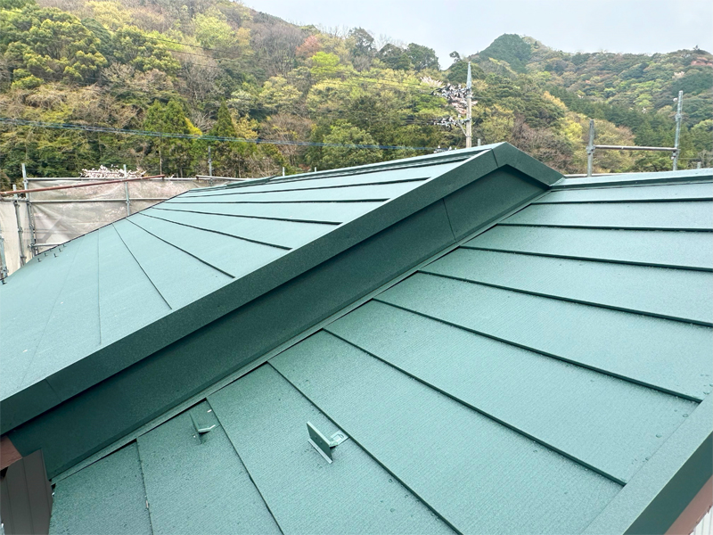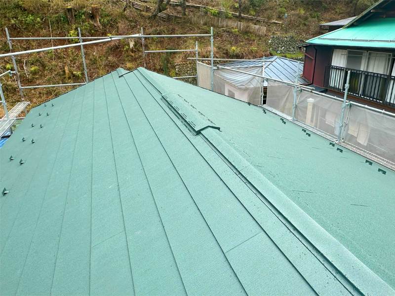 上部の大屋根は、時間・費用を節約できるカバー工法で、稲垣商事(株)製の金属屋根材のヒランビー220(色モスグリーン)で葺き替えました。