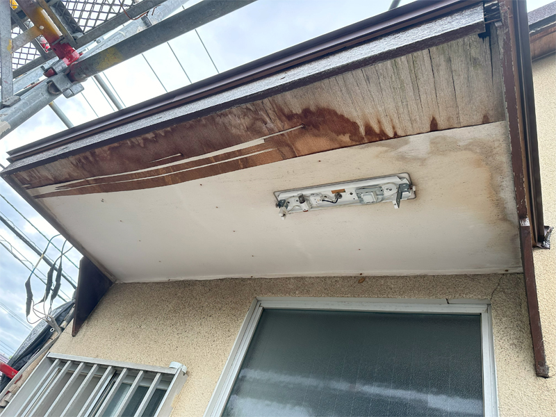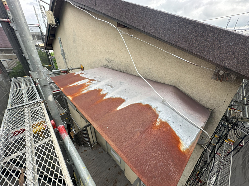 同時に雨樋を交換し、サビていた霧除けはガリバリウム鋼板で葺き替えました。軒天板金も同様に、ガリバリウム鋼板で仕上げました。