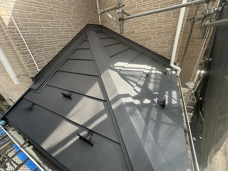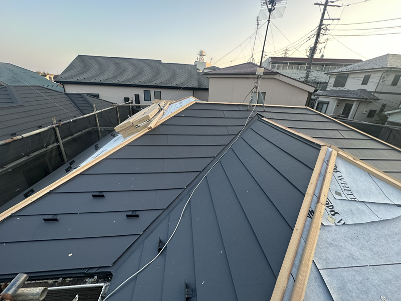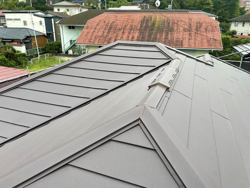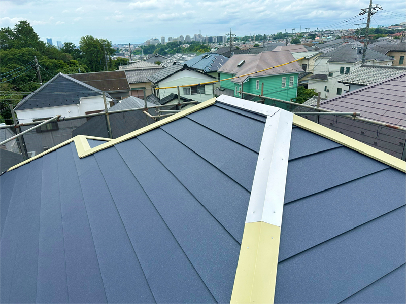 カバー工法での稲垣商事(株)製の金属屋根材のヒランビー220で葺いた完成状態。